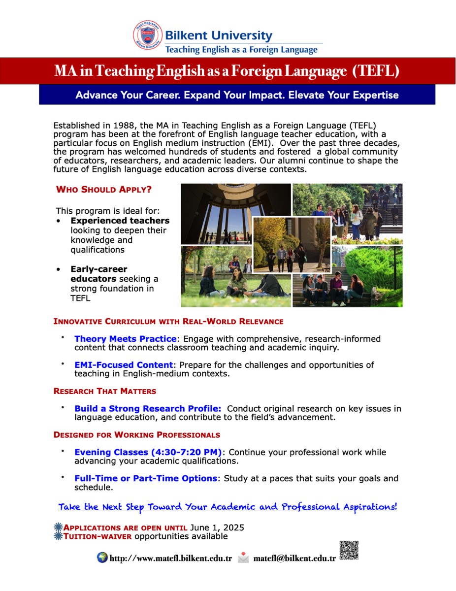 The Master of Arts in TEFL program is designed for practising, and aspiring English language educators with a scholarly mindset who seek to pursue, or advance, their careers in academic and professional settings.